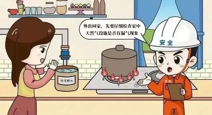 外出回家,先要仔細(xì)檢查家中天然氣設(shè)施是否有漏氣現(xiàn)象,確認(rèn)無(wú)異常后,再啟用燃?xì)庠O(shè)施及用具。