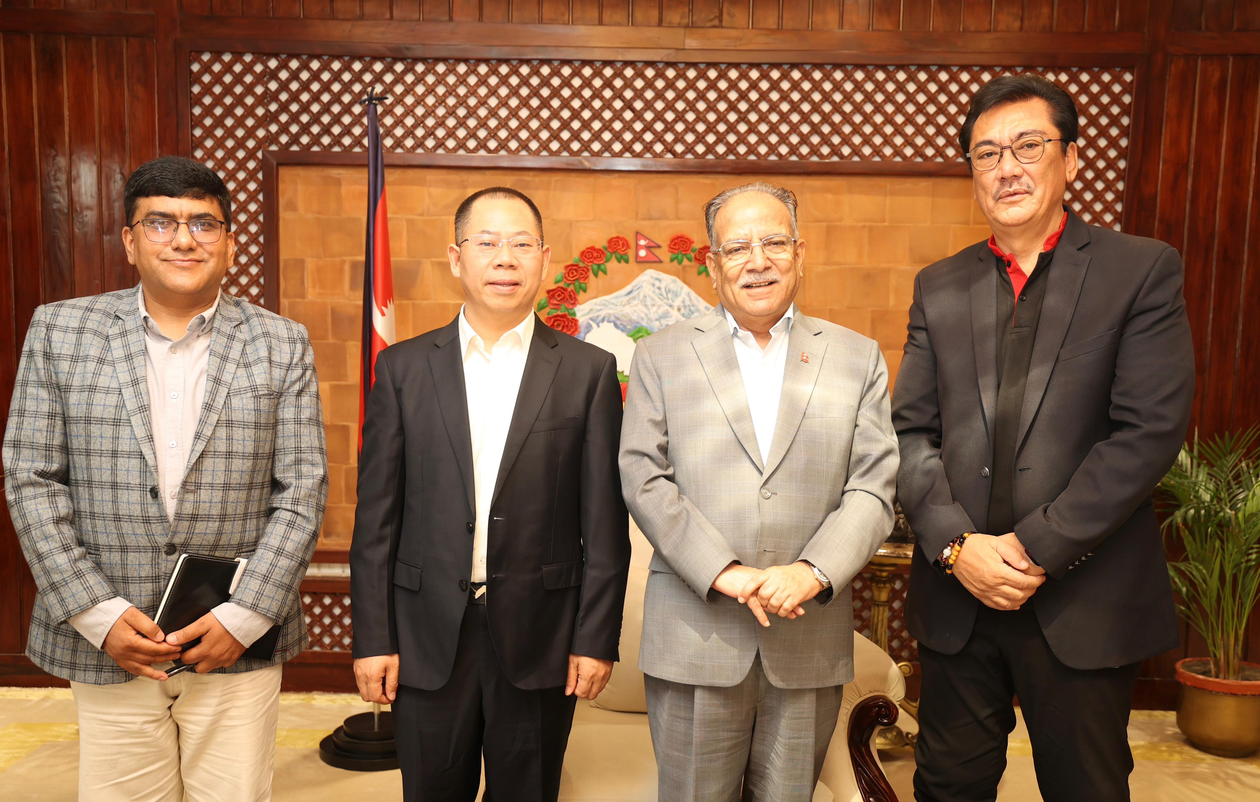 尼泊爾國(guó)家總理普拉昌達(dá)(右二)會(huì)見(jiàn)華新尼泊爾納拉亞尼公司總經(jīng)理向長(zhǎng)宏一行