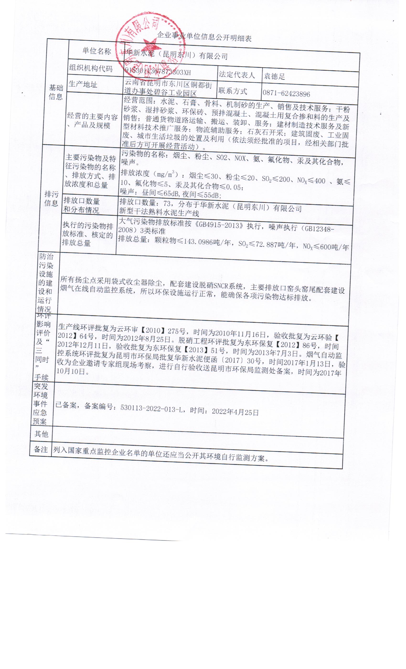 根據(jù)企業(yè)事業(yè)單位信息公開文件要求,華新水泥(昆明東川)有限公司對企業(yè)事業(yè)單位信息明細(xì)表(包含基礎(chǔ)信息、排污信息、防治污染設(shè)施建設(shè)和運行情況、環(huán)評影響評價及“三同時”手續(xù)、突發(fā)環(huán)境事件應(yīng)急預(yù)案),自行監(jiān)測方案,2024年第二季度窯頭在線監(jiān)測季度報表,2024年第二季度窯尾在線監(jiān)測季度報表,第二季度比對委托監(jiān)測,第二季度自行性委托監(jiān)測進(jìn)行公示。